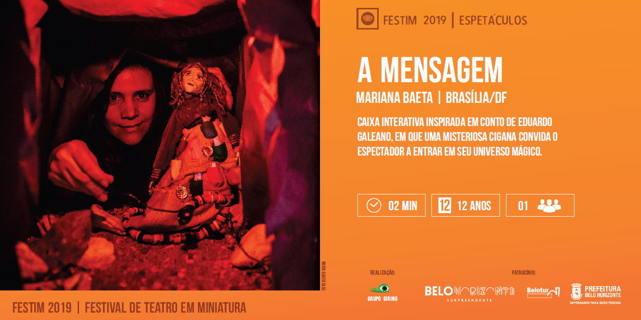 Release: A Mensagem, criado e encenado pela atriz e bonequeira Mariana Baeta, apresenta questões femininas e humanas a partir de bonecos em miniatura de manipulação direta. A Mensagem é uma caixa interativa inspirada em um conto de Eduardo Galeano, em que uma misteriosa cigana convida o espectador a entrar em seu universo mágico.