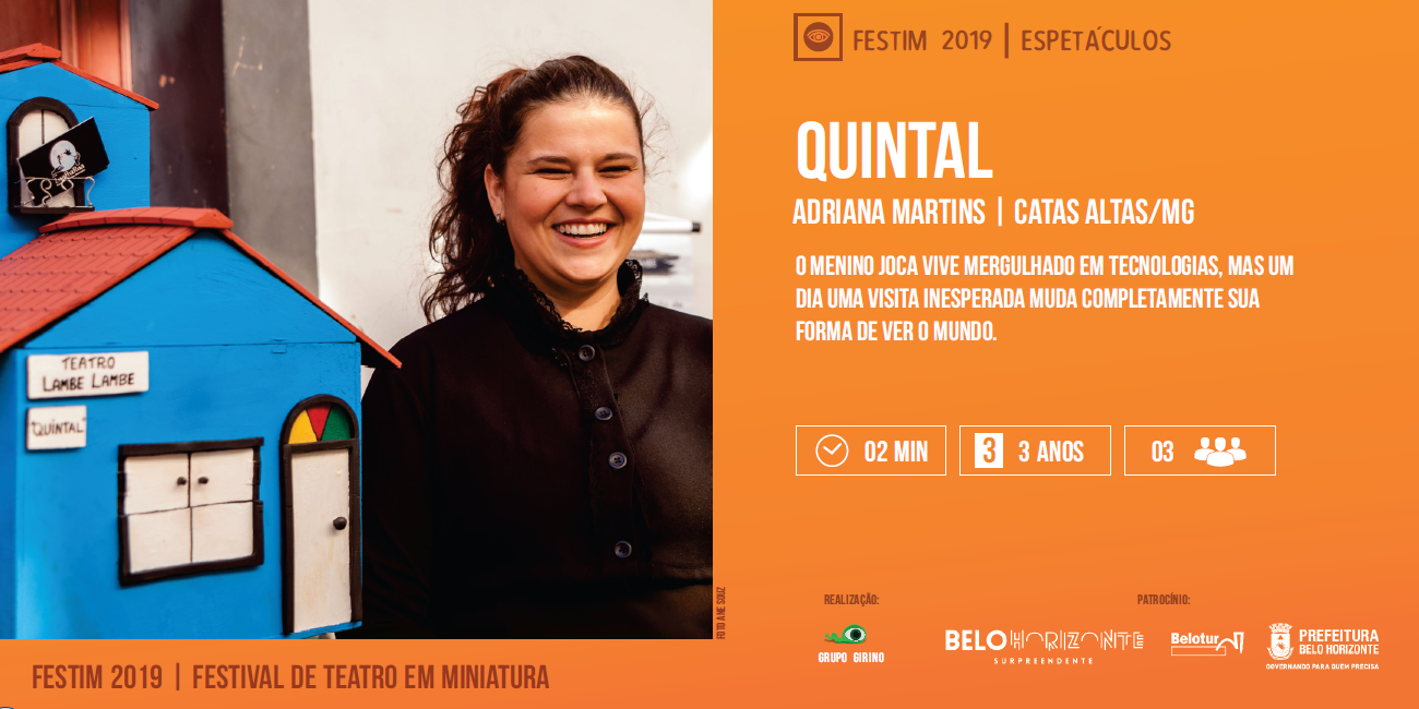 Belo Horizonte recebe entre 05 e 08 de dezembro, a 8a edição do FESTIM – Festival de Teatro em Miniatura. Realizado pelo Grupo Girino, com o patrocínio da Belotur e Prefeitura Municipal de Belo Horizonte, o Festival apresenta 15 espetáculos com apresentações gratuitas. Em 2019 o FESTIM propõe uma programação exclusiva no Parque das Mangabeiras, oferecendo para o público uma experiência teatral em um dos principais espaços de lazer e turismo de Belo Horizonte.