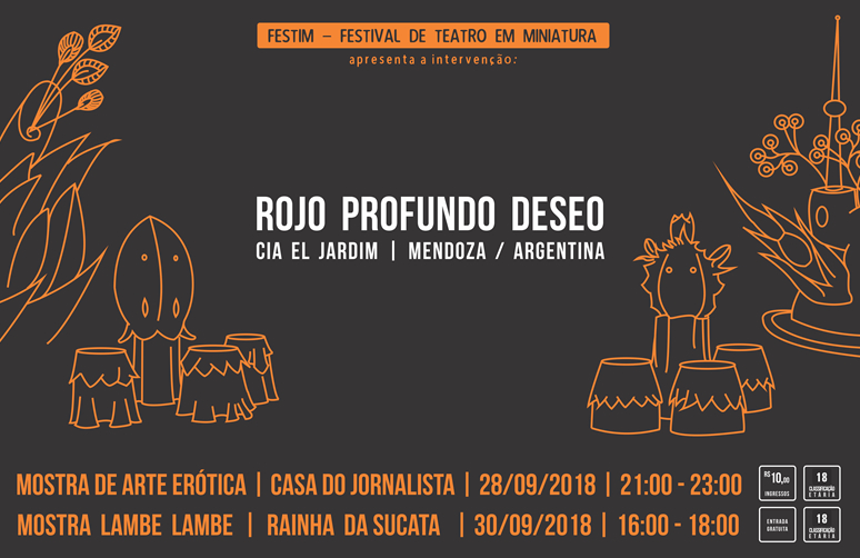 A companhia argentina El Jardin apresenta a intervenção“Rojo Profundo Deseo”, inspirado no quadro “O jardim das delícias” de Hieronymus Bosch. Quatro personagens fazem um convite ao mundo erótico, uma proposta ao espectador de se entregar ao prazer dos sentidos, sem etiquetas, sem ansiedades. Disfrutar com liberdade. Em repertório, estão as apresentações “Inferno”, “Paraíso” e “O Jardim”. A intervenção é apresentada em caixas de Teatro Lambe Lambe, técnica do Teatro de Bonecos em que o público assiste ao espetáculo através de um visor e com fones de ouvidos.